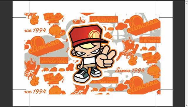 Once we’ve got the front side laid out we need to indicate what is going to be embossed. Anything we want embossed needs to be on a separate layer and set to 100% black ink. With our design, the section we want embossed is our Clubcard Peace character in the center of the card. So what we did was create an exact copy of the character and set it to 100% black ink. Here you can see where the embossing will go.