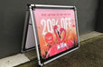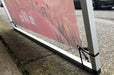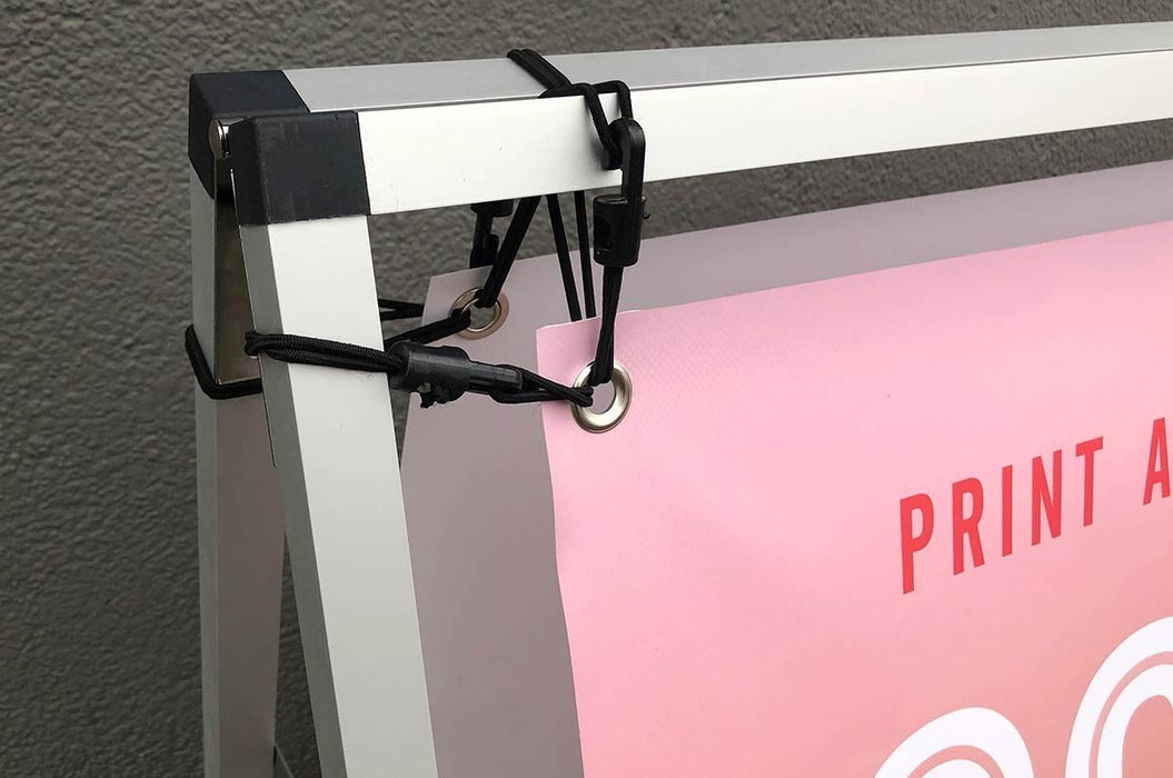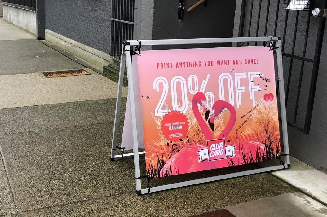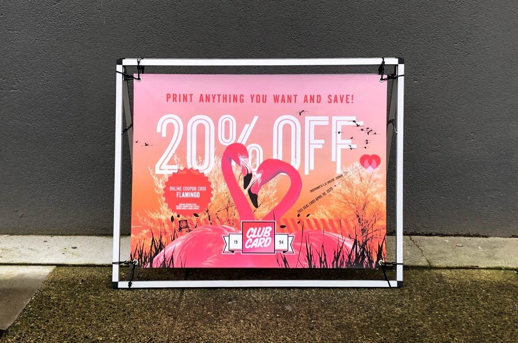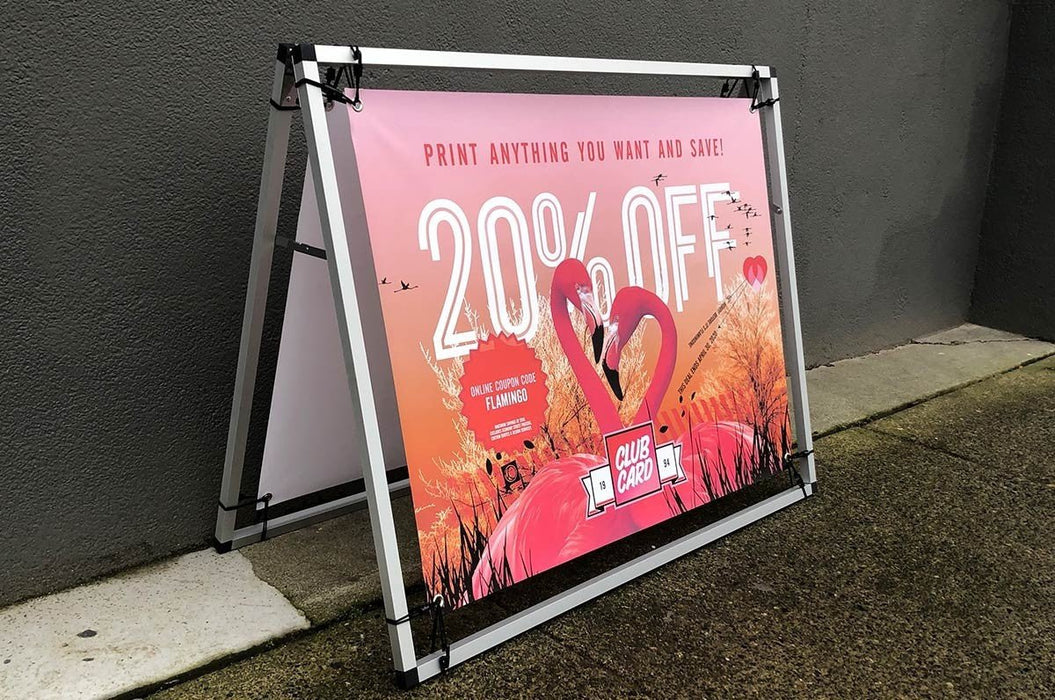 The small size Arena A-frame Banner Frame kit includes a lightweight aluminum a-frame stand with one or two custom printed 33.5" tall x 44" wide full color vinyl banners that advertise your brand on one or both sides.