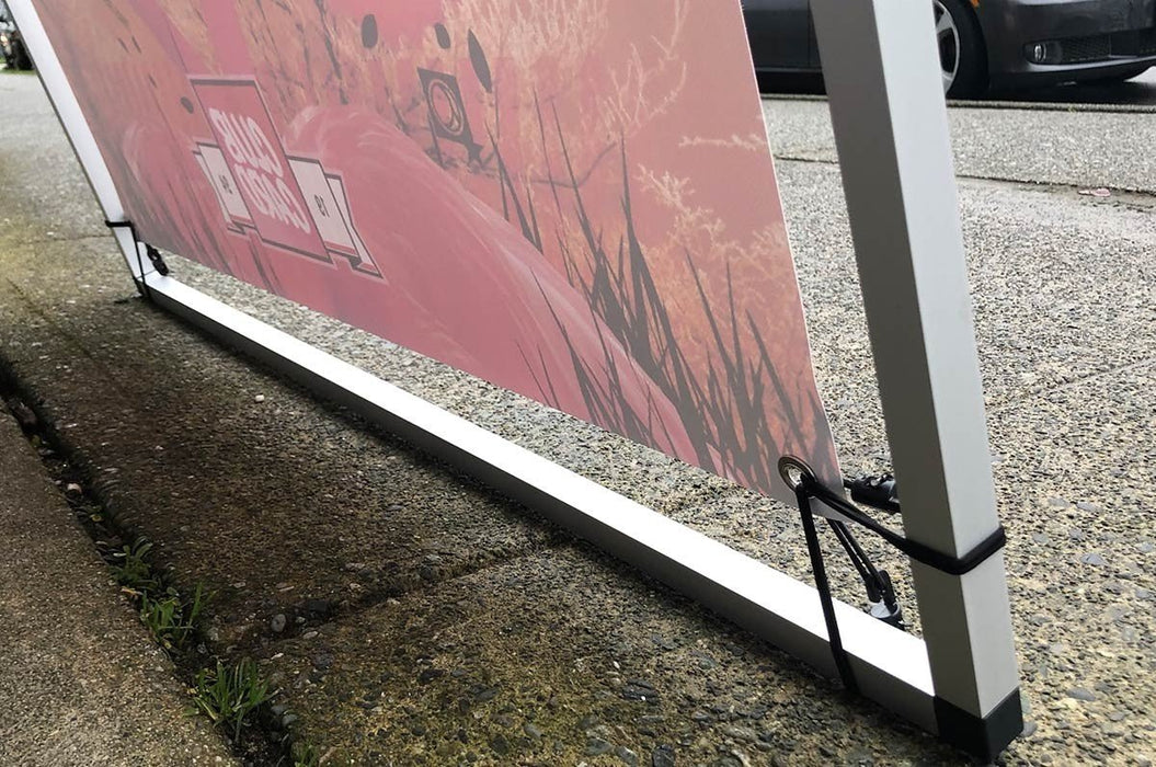 Your arena banner stand kit comes in a material carry case and includes bungee cords to lace through the grommets on your banners, a lightweight aluminum a-frame stand and ground pegs to keep your stand in place on windy days.