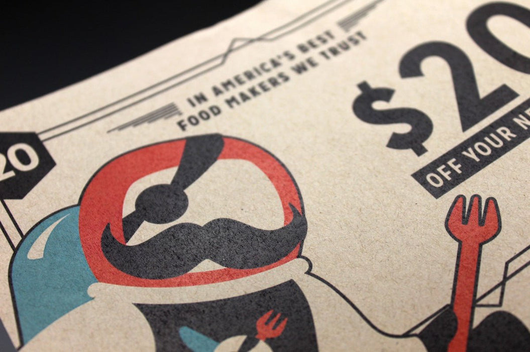 This paper is a wonderful palette to print on with our full color plus optional white ink printing providing new ways to work with color. We print these paper fliers in sizes ranging from 4" x 4" to 12" x 18".